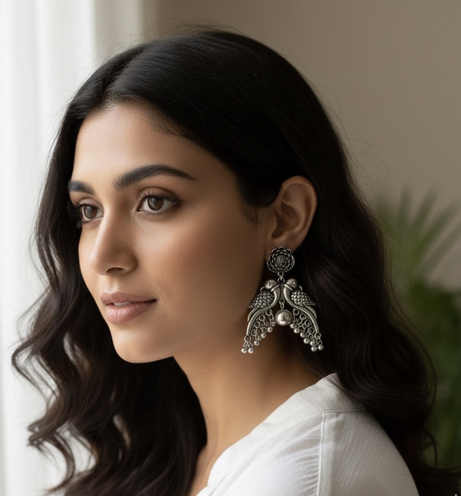Step into a world of enchanting beauty with these Oxidized Silver-Toned Dual Peacock Dangle Earrings. These captivating earrings feature a stunning pair of peacocks, meticulously crafted with intricate detailing, symbolizing grace and beauty. Suspended beneath is a delicate array of silver-toned beads, mimicking classic jhumka styles, that sway gently with every movement. The antique oxidized finish enhances the traditional artistry, making these a perfect statement piece for festive celebrations, cultural events, or to infuse your everyday look with bohemian charm. Lightweight and designed for comfort, these earrings are a true testament to artisanal craftsmanship.