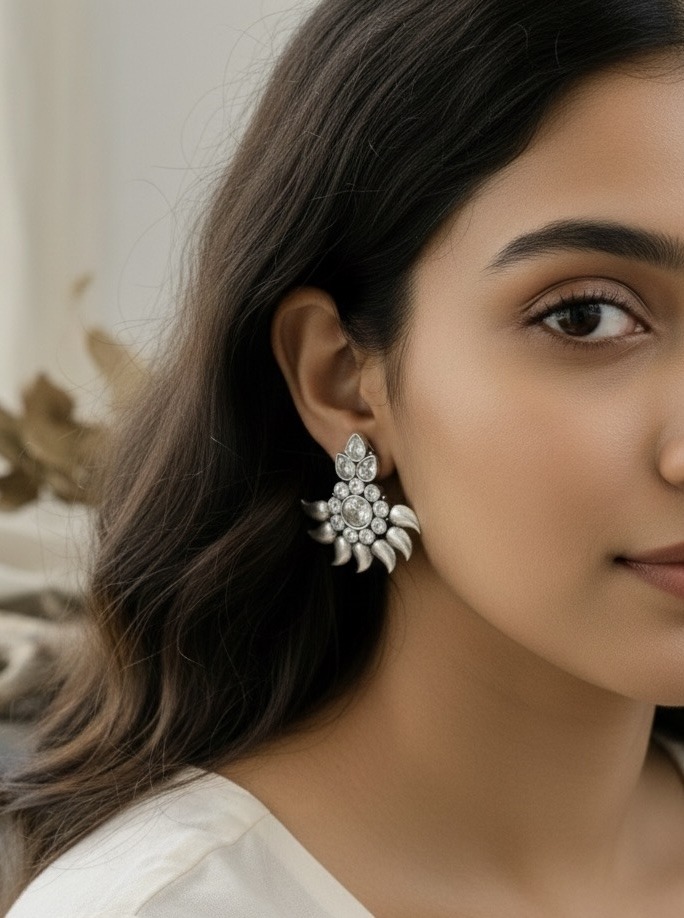 Embrace radiant ethnic charm with these exquisite Oxidized Silver-Toned Kundan & Petal Stud Earrings. Featuring a brilliant cluster of high-quality Kundan stones, these earrings sparkle with every movement. The central design is gracefully framed by intricate petal-like details in an antique oxidized finish, adding a unique fusion of traditional grandeur and modern artistry. Perfect for weddings, festivities, or to elevate your everyday ensemble, these lightweight studs offer both comfort and captivating style. Make a statement that exudes elegance and cultural richness.