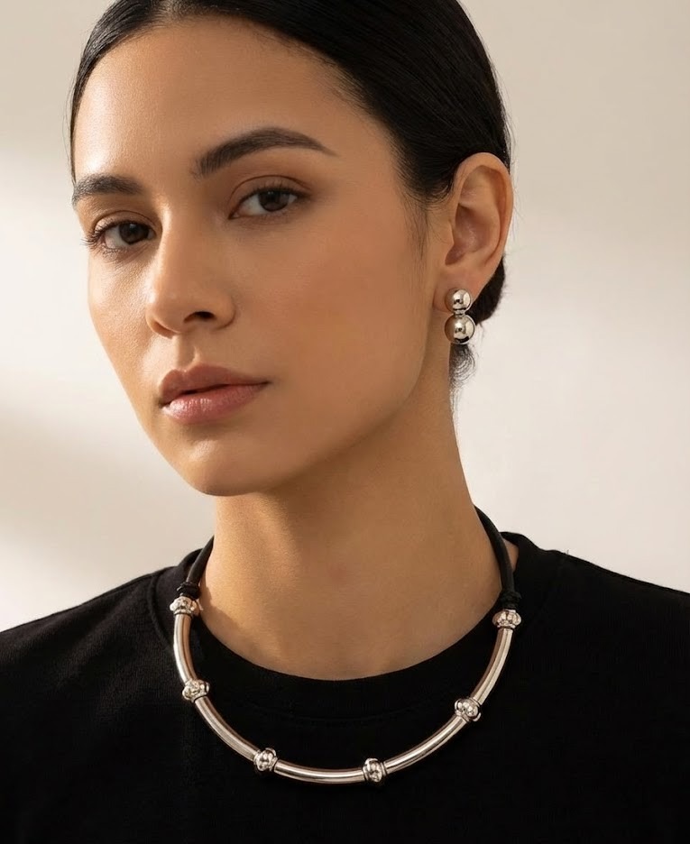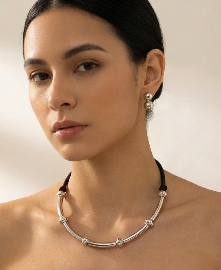 Unlike heavy traditional metal collars, this piece is designed for superior comfort. The silver segments are threaded onto a durable, black flexible wire (synthetic cord) that rests softly against the skin, offering a lightweight feel with a structured look.