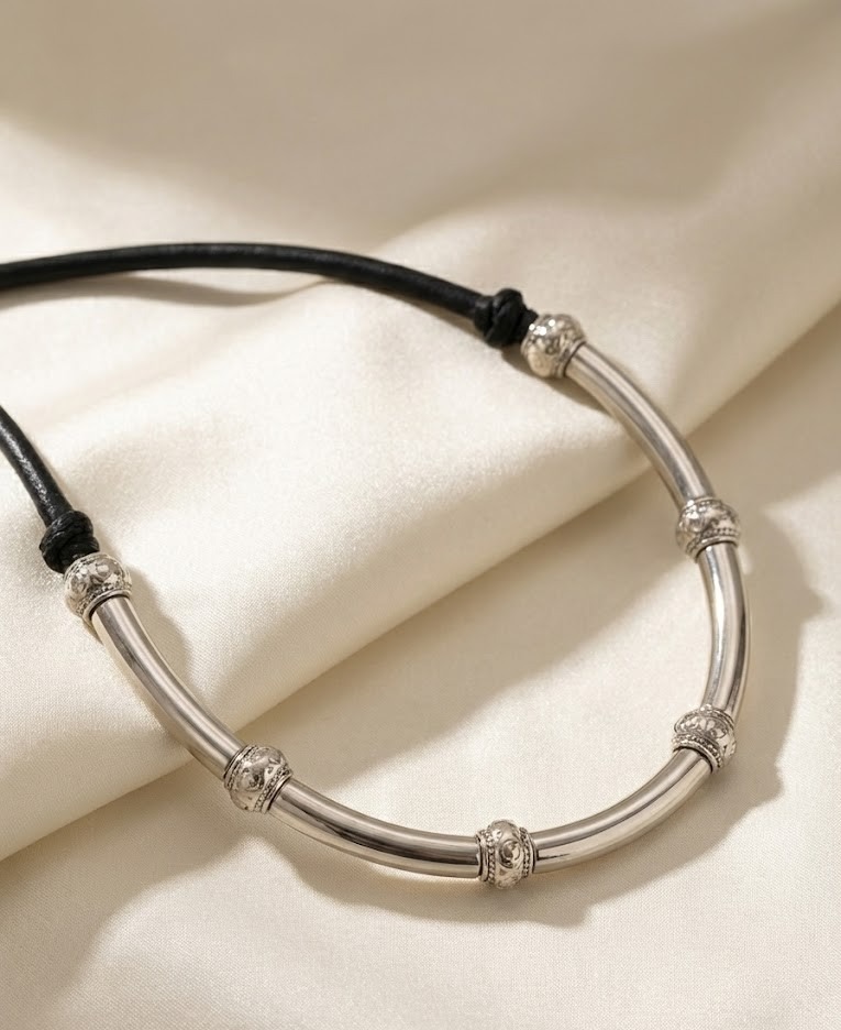 Modern Silver Hasli Choker – Tribal Tube Necklace on Black Flexible Cord