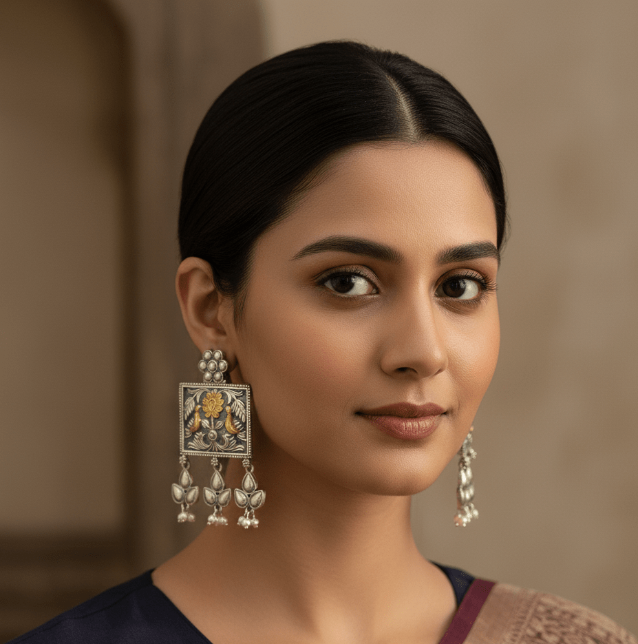 • Rectangular/Square Body: Each earring features a prominent square-shaped panel, richly detailed with a traditional bird and floral motif.