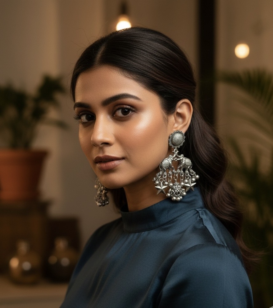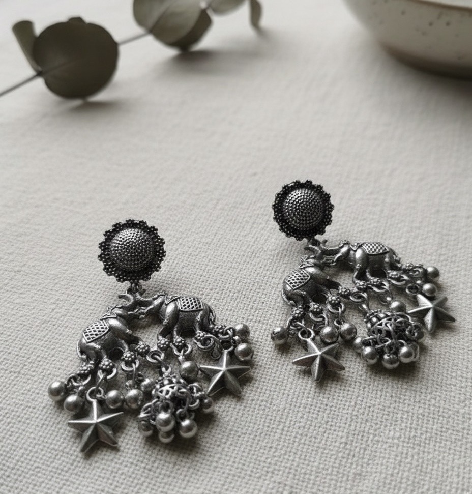 Gracing the model’s ears, The Elephant Jubilee Drops command attention with their approximate 2.5-inch length, offering a playful yet sophisticated appeal. Each earring features a detailed oxidized silver stud, from which a pair of intricately crafted elephants dangle, their trunks entwined. Below them, a vibrant cluster of silver charms—including tiny bells, delicate spheres, and charming stars—sways with every movement, creating a delightful symphony of shapes and textures. These earrings are a celebration of artistry and charm, perfect for adding an exotic touch to any outfit.”