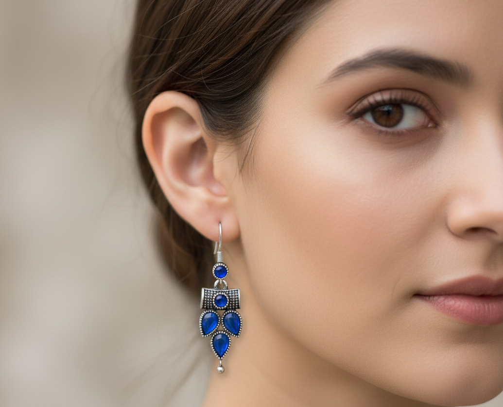 Elevate your jewelry collection with these stunning Blue Teardrop Dangle Earrings. Crafted with an intricate antique silver finish, these earrings feature a vibrant circular blue stone at the crown, followed by a graceful cluster of three teardrop-shaped azure gems.